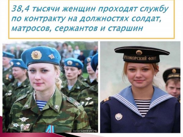 Находясь на службе по контракту в Вооруженных силах, женщина сможет самореализоваться в своей профессии. Ведь недаром 40 тысяч представительниц различных профессий выбрали военную службу. И 15% из них имеют звание полковника.
