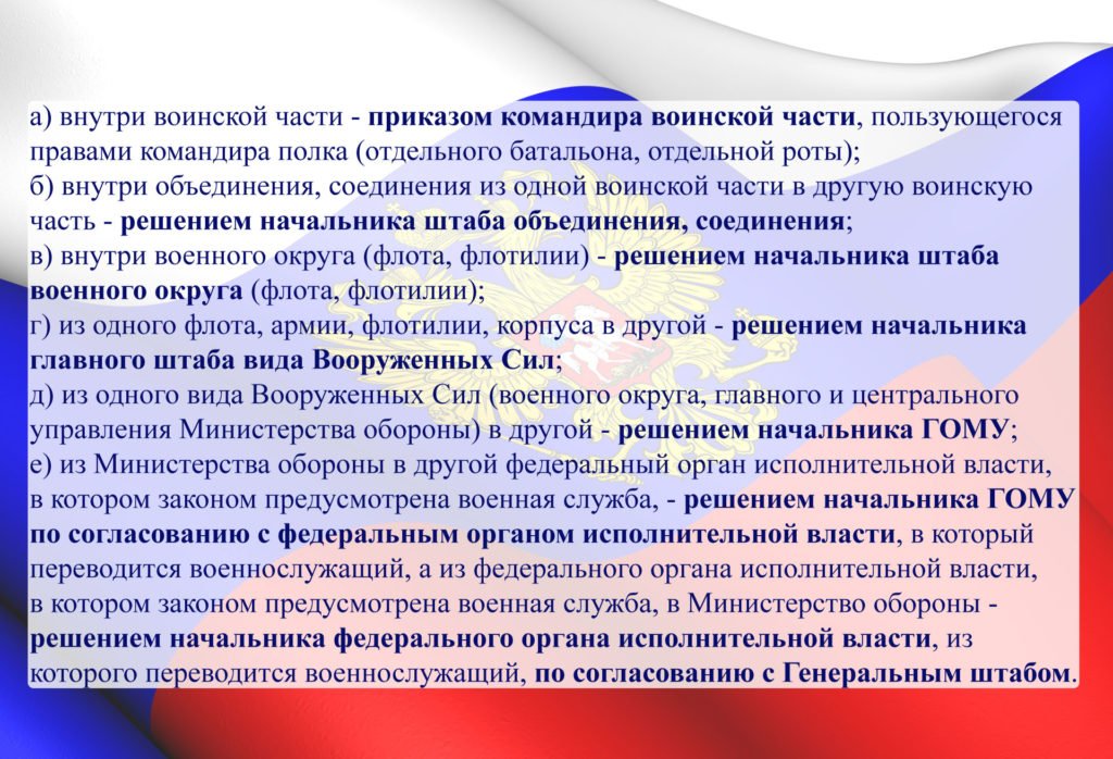Российское законодательство освещает вопросы смены места службы в нескольких документах. Так, в Приказе Министерства обороны № 30 (от 16.01.