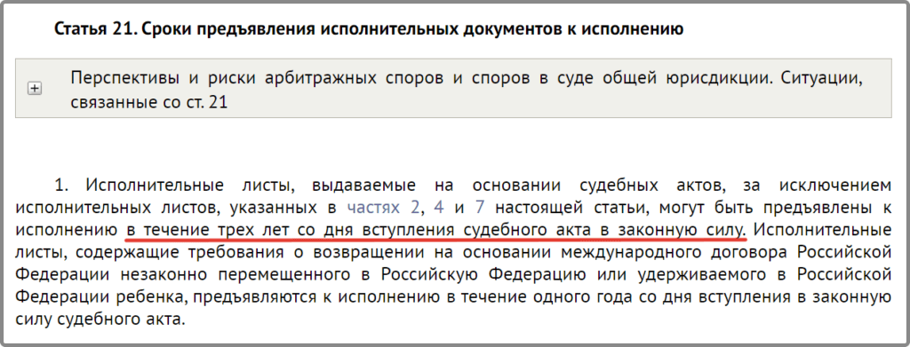 При повторной подаче ИЛ важно учитывать сроки, установленные ст.21 Закона «Об исполнительном производстве». Данный период составляет 3 года с момента вынесения судебного решения.