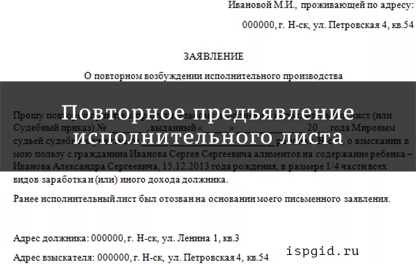 Заявление на повторное предъявление исполнительного листа к исполнению