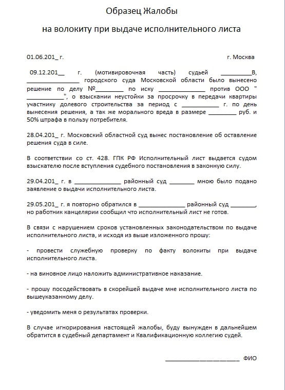 Образец жалобы на волокиту при выдаче исполнительного листа