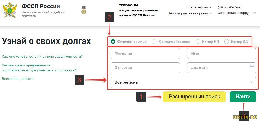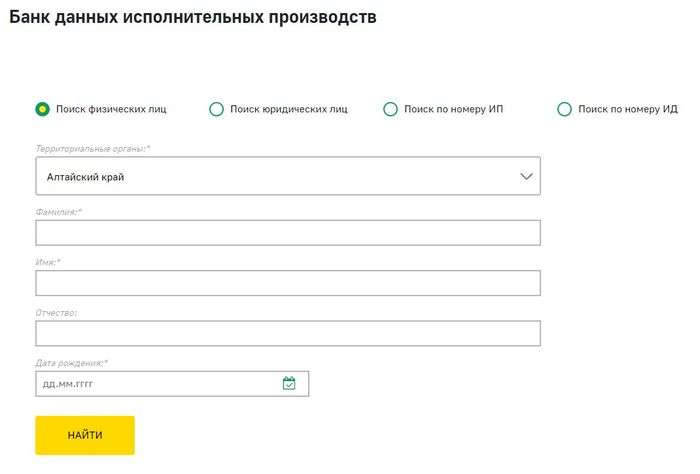 - Выбрать территориальный орган, ввести ФИО и указать дату рождения должника;
