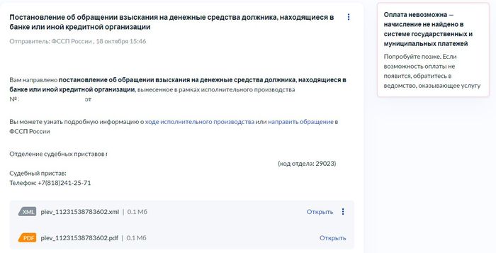 При обнаружении производства вы увидите всю информацию о нем: дату, сумму задолженности, реквизиты. Также в результатах поиска будет присутствовать информация об отделе ФССП, который занимается конкретным ИП, и контакты пристава.