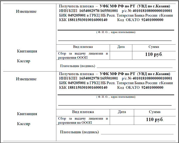 - В местном отделе МВД. Здесь подается заявление на получение лицензии, а потом выдаются подтверждающие документы. На главном стенде обычно висит объявление с реквизитами либо пример квитанции. Также эту информацию может продублировать сотрудник местного отделения МВД или выдать квитанцию с уже записанными реквизитами.