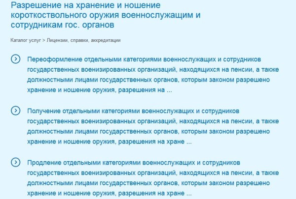 - Переходим по ссылке «Разрешение на хранение и ношение оружия».
