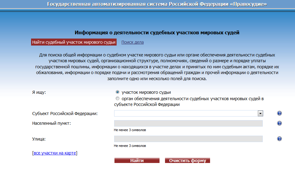 Если номер вам неизвестен, а известен участок и данные судьи, ищите в разделе вкладку «Найти участок мирового судьи», выберите нужный субъект Российской Федерации, пункт и улицу.