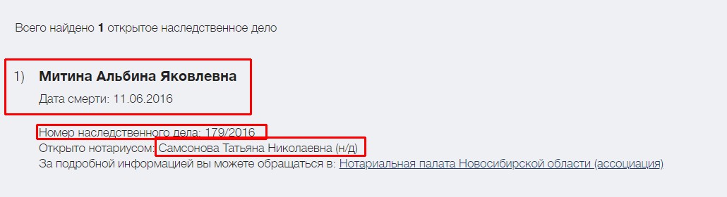 Также можно узнать ФИО нотариуса, который занимался наследством. Буквы н/д — означает «не действующий». То есть нотариус не работает в настоящее время. Чтобы узнать где в настоящее всремя находится наследственное дело — нужно обратиться в Нотариальную палату Новосибирской области.