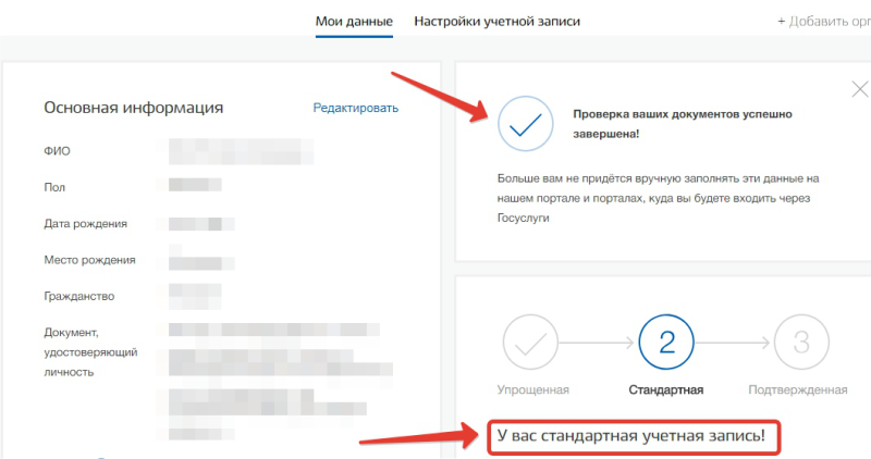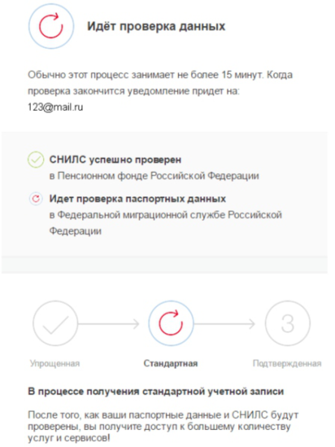 По окончании проверки на Ваш электронный адрес будет направлено уведомление. В случае успешной проверки Ваших данных статус Вашей учетной записи сменится с «Упрощенная» на « Стандартная»