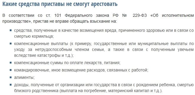 Разъяснения по этому вопросу можно найти в ст. 101 закона № 229-ФЗ. Например, вообще нельзя списывать деньги по долгам с пенсии по потере кормильца, с социальных пособий и выплат на детей, с зачислений по алиментам, по некоторым другим видам доходов.