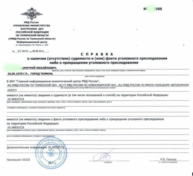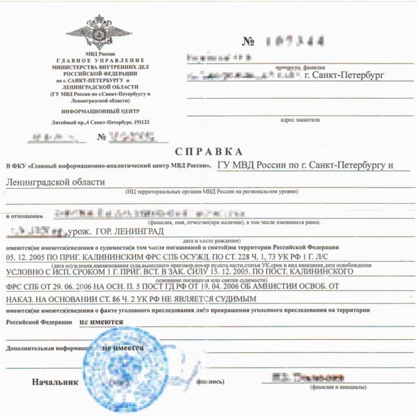 В данной справке отображается информация о наличии или же отсутствии судимости. Если у гражданина судимость имелась, в справке будет отображена полная информация о судимости.