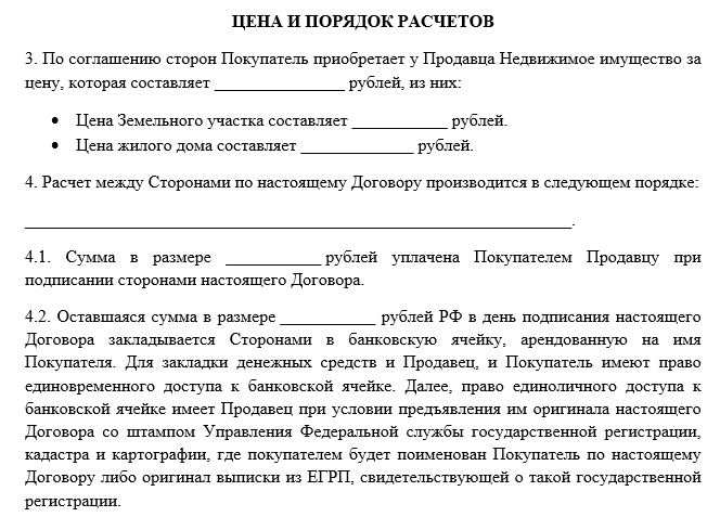 - Сумма, которую покупатель должен будет выплатить продавцу. Чаще всего фиксируются разные виды сумм – общая и отдельные за дом и участок.