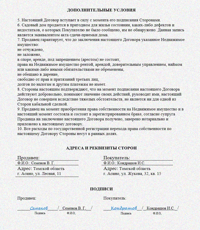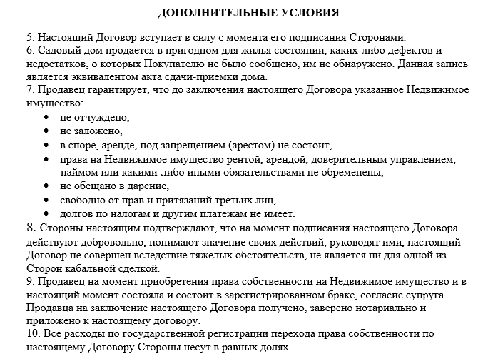 При желании покупатель может попросить продавца дополнительно указать, что по отношению данного объекта не осуществляется никаких других сделок. Нелишним будет прописать тот факт, что участники сделки – это дееспособные лица, отдающие отчет своим действиям.