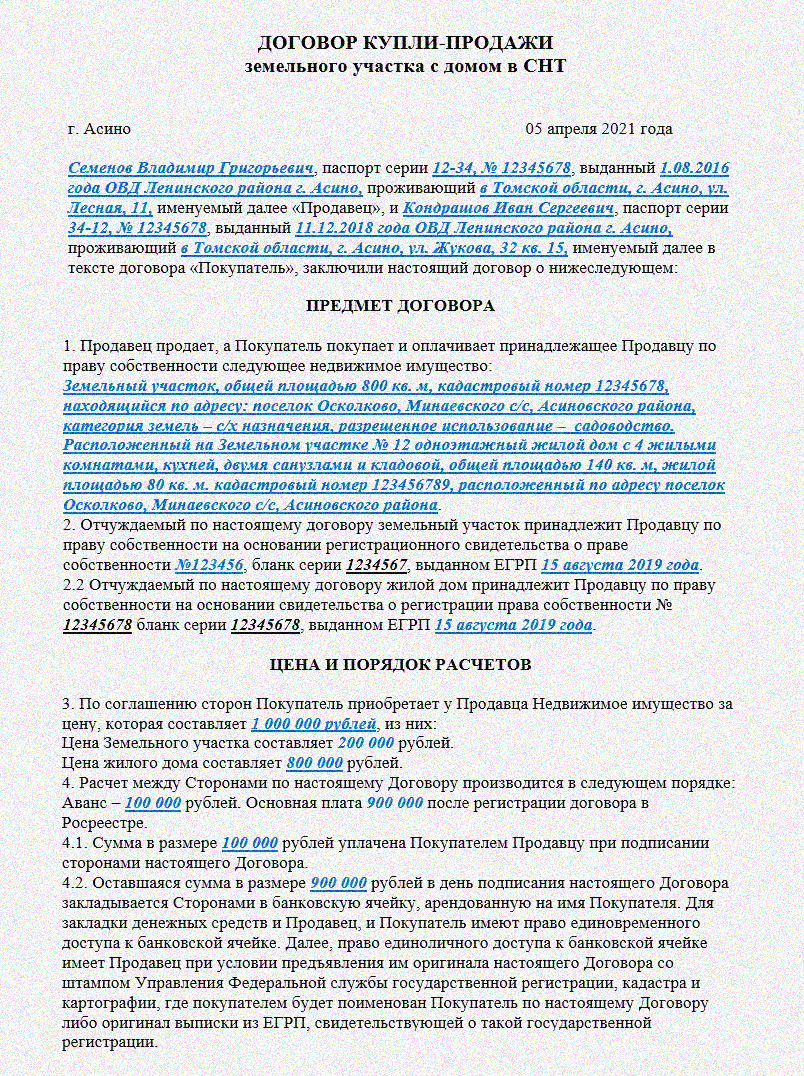 к содержанию ↑Заполненный образец договора купли-продажи земельного участка с домом в 2025 году