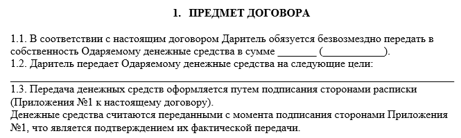 - Целевое назначение. Этот пункт отличает ДДДС от стандартного соглашения. Здесь отображается цель передачи денег одаряемому лицу.