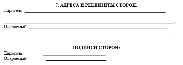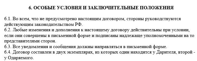 5) Права и обязанности сторон. В этом разделе необходимо отобразить обстоятельства, при которых даритель и одариваемый могут отказаться от дара или расторгнуть ДДДС. Здесь же можно отметить подтверждение факта передачи денег, например, после подписания приемопередаточного акта.