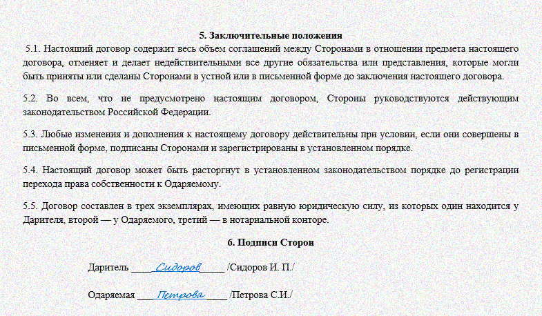 - Если одариваемое лицо имеет возраст от 6 до 14 лет, то соглашение может быть подписано лишь в присутствии представителя ребенка (родители или опекун).
