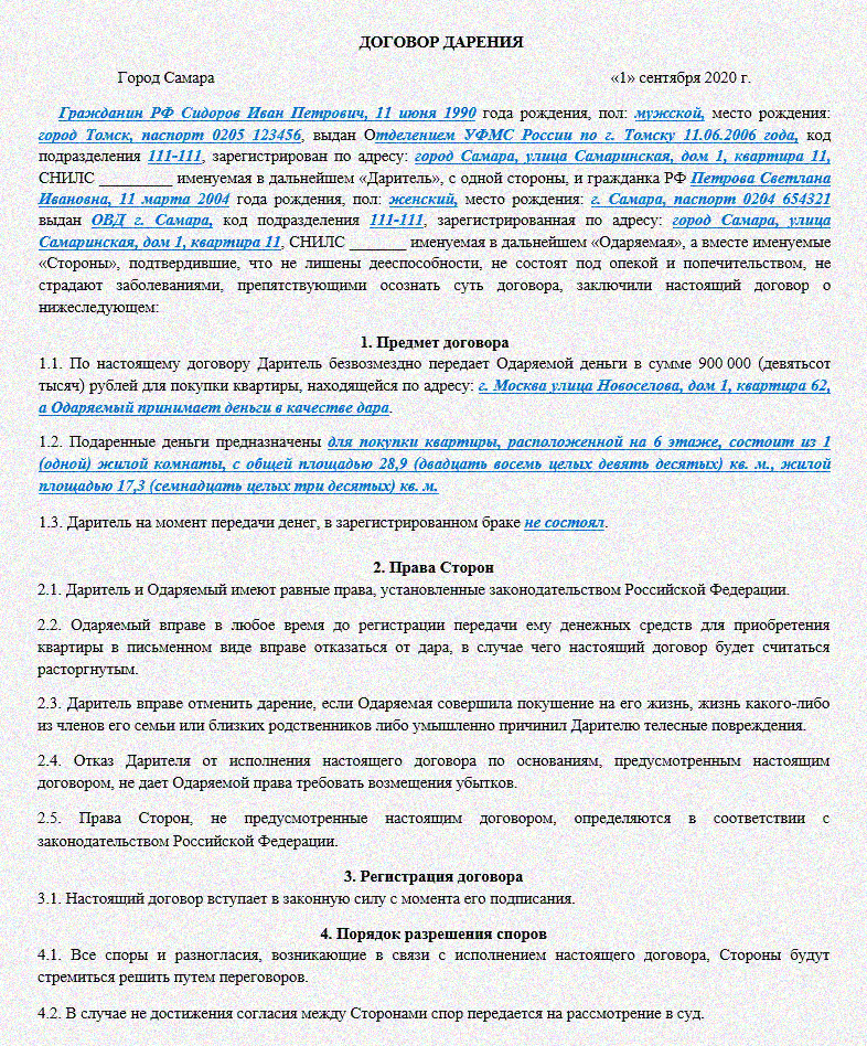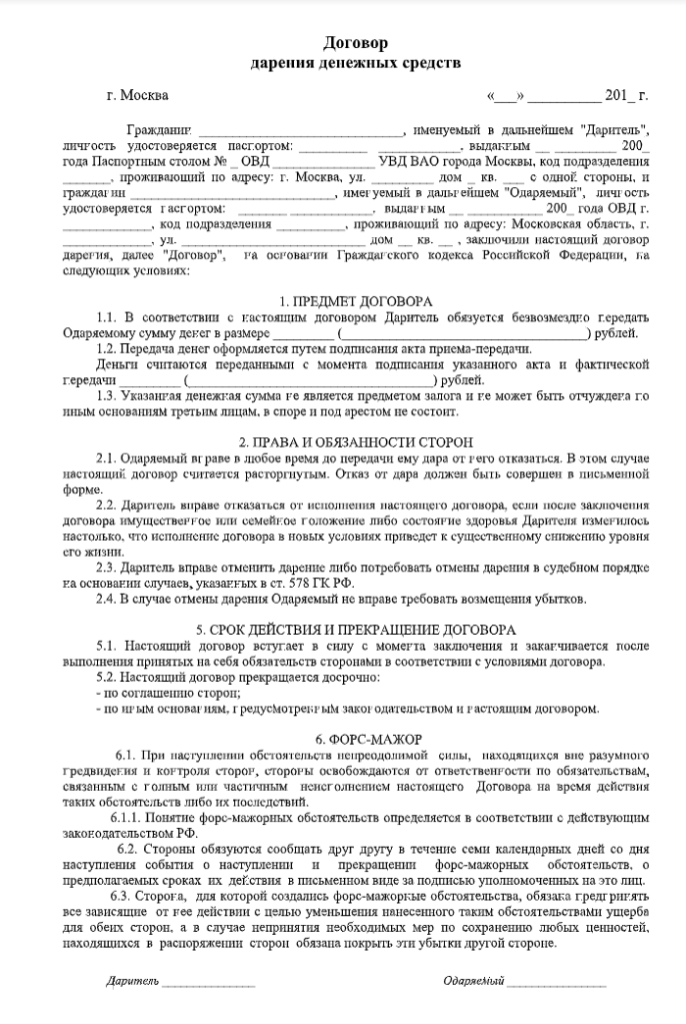 Форма договора дарения денег