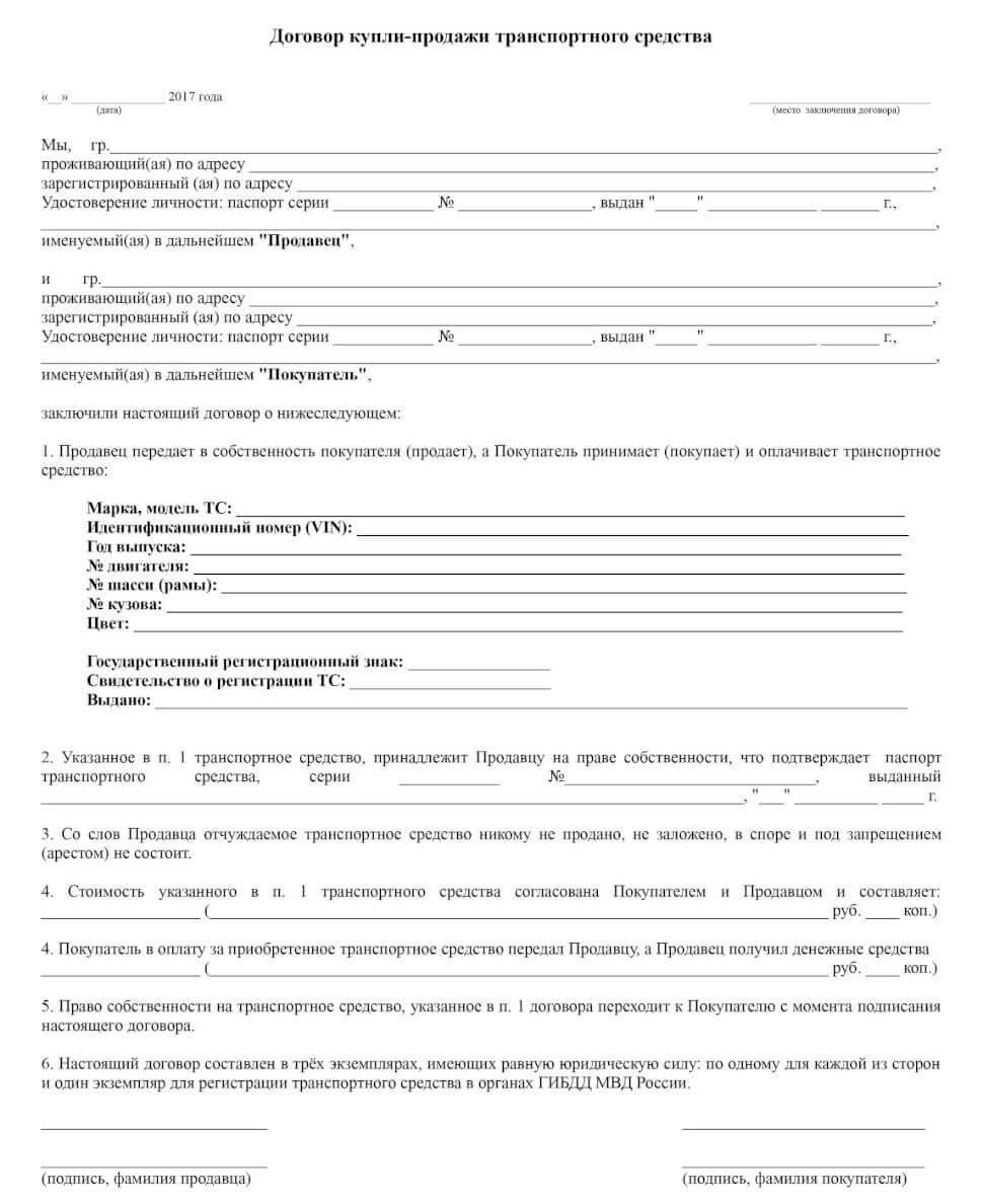 Договор купли-продажи транспортного средства нужно распечатать в трех экземплярах (продавцу, покупателю и ГИБДД) и подписать каждый экземпляр обеими сторонами сделки. Скачайте бланк или заполните онлайн.