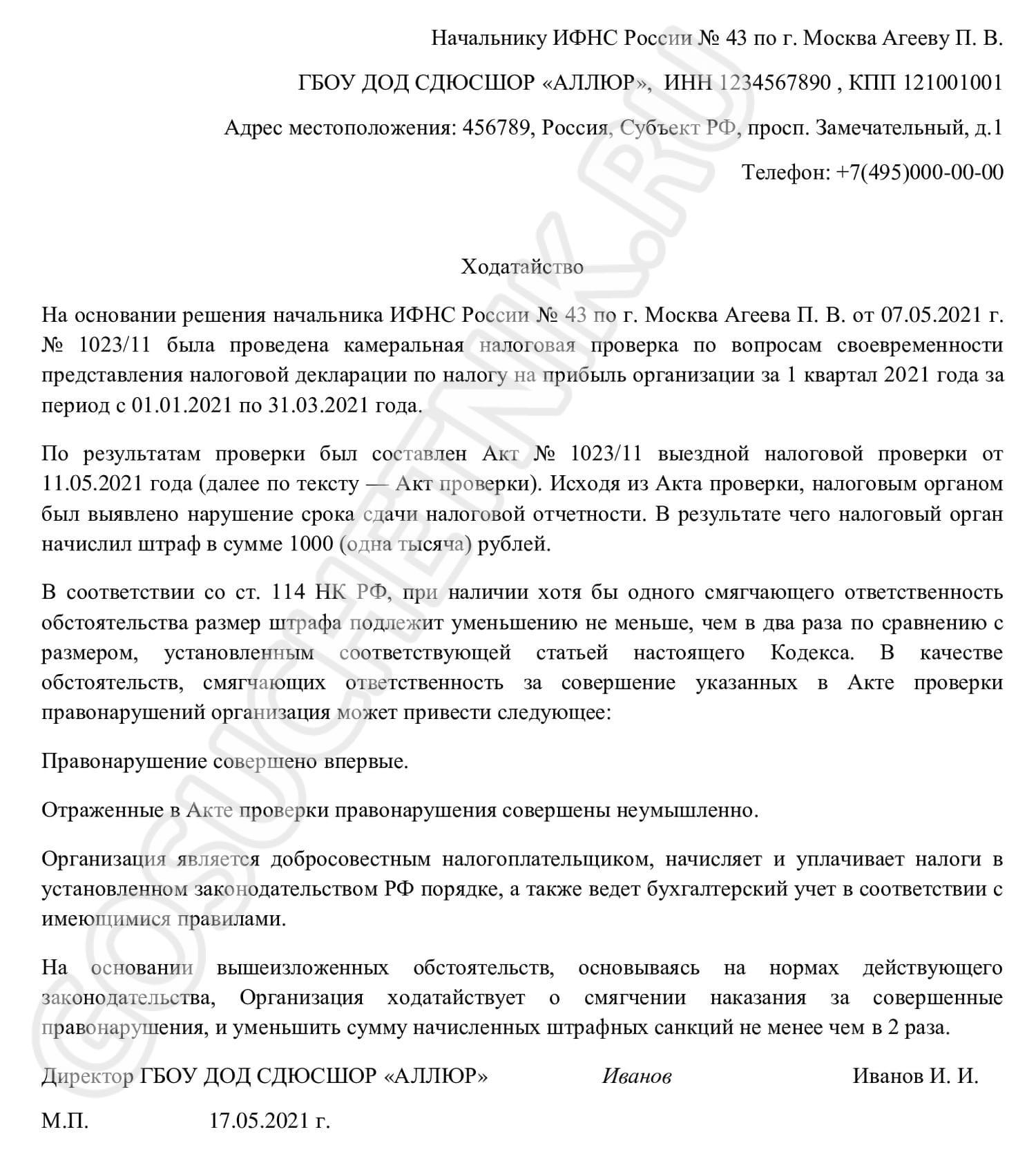 ГБОУ ДОД СДЮСШОР «АЛЛЮР» предоставило декларацию по налогу на прибыль за 1-й квартал 2021 года с опозданием — 04.05.2021 (последний срок — 28 апреля). ИФНС направила акт камеральной проверки. Так выглядит образец ходатайства в налоговую о снижении штрафа в 2021 году: