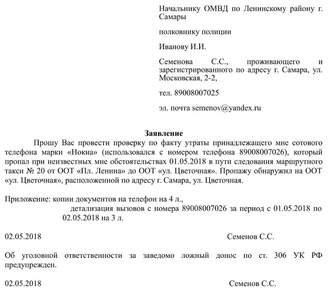 Составленный по всем правилам документ можно выслать по почте заказным письмом на имя начальника местного отдела полиции.
