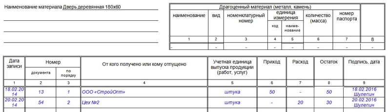 Пример заполнения карточки складского учета материалов можно посмотреть ниже.