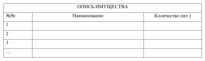 - Составляем табличную часть. Рекомендуется добавить колонки: номер по порядку, название предмета, его характеристики, запись о текущем состоянии в следующем виде: отличное, хорошее, удовлетворительное, неудовлетворительное.