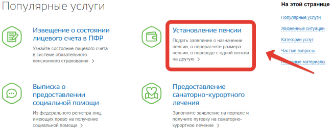 После авторизации пользователю необходимо войти на главную страницу сайта, где следует выбрать раздел «Услуги». На экране сразу появится список их различных категорий. Среди них следует нажать на «Пенсия, пособия и льготы», а затем выбрать подраздел «Установление пенсии».