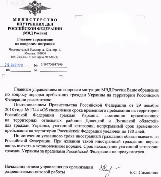 В соответствии с указанным положением 29 декабря 2018 г. было принято Постановление Правительства РФ № 1744 «Об увеличении срока временного пребывания на территории Российской Федерации граждан Украины, постоянно проживающих на территориях отельных районов Донецкой и Луганской областей Украины» (действует с 8 января 2019 г.), согласно которому для данных лиц срок временного пребывания в России продлен до 180 суток с даты каждого въезда.
