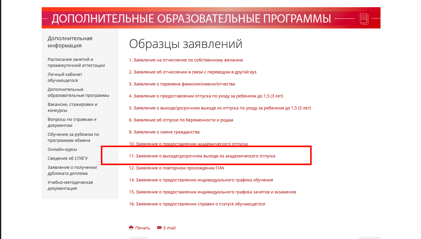 Страница с образцом заявления о выходе из академического отпуска в СПБГУ