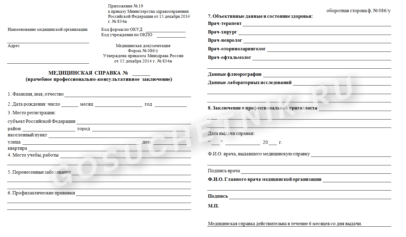 Например, при поступлении лицам мужского пола оформляется медицинская справка формы ф086/у с дополнительной формой ф025/ю. Это «Медицинская карта пациента, получающего медицинскую помощь в амбулаторных условиях» (Приложение №1 к Приказу Минздрава России от 15.12.2014 №834н (ред. от 09.01.2018)).