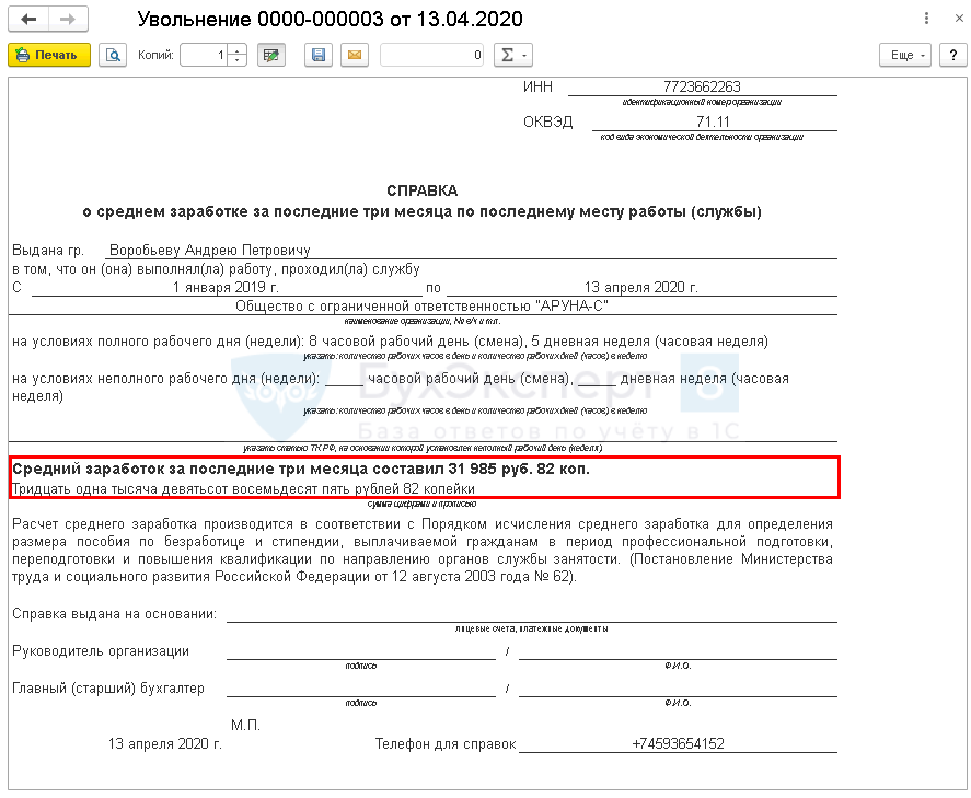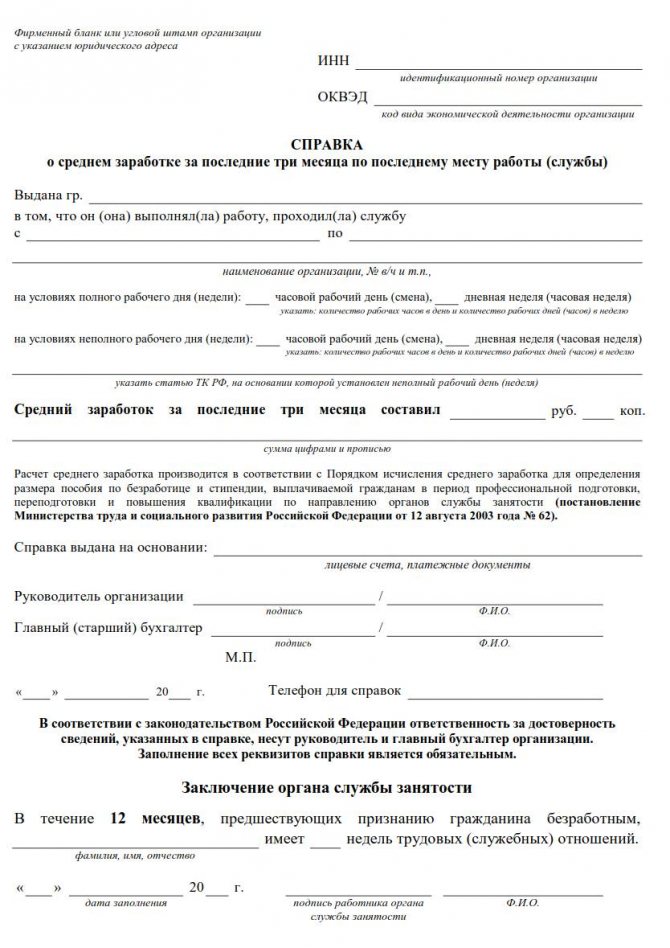 Справка о среднем заработке за последние 3 месяца для центра занятости