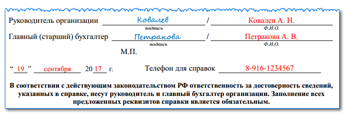 | Подпись на справке | Выданную справку для центра занятости в обязательном порядке подписывает руководитель предприятия и главный бухгалтер с указанием фамилии и инициалов. Справка заверяется печатью предприятия, а так указывается контактный номер телефона предприятия |