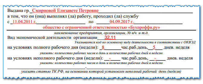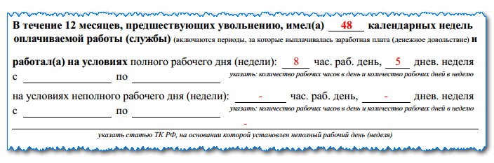 - если сотрудник работал в режиме неполного рабочего дня или недели, ниже следует уточнить статью трудового законодательства, на основании которой такой режим работы применялся;