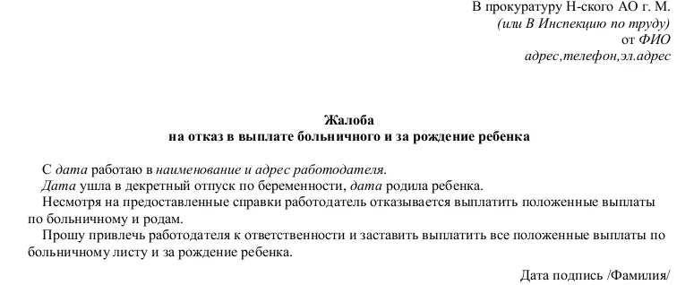 Жалоба заверяется собственноручной подписью составителя, указывается текущая дата. К обращению обязательно прикладываются подтверждающие документы: копия трудового договора и больничного листа.