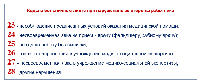 В строке «Отметки о нарушении режима» листке нетрудоспособности такие нарушения врач обозначает специальным двузначным кодом (п. 65 Порядка, утв. Приказом Минздрава от 01.09.2020 № 925н).